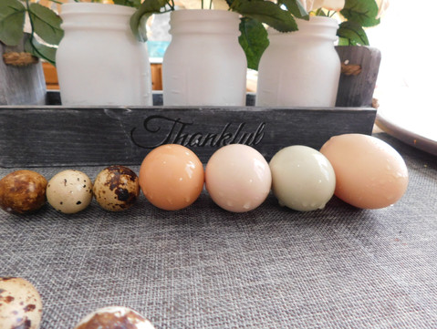 The three eggs on the left are all quail eggs. Did you know that once a quail lays a certain pattern they usually continue that pattern throughout their laying lifespan.